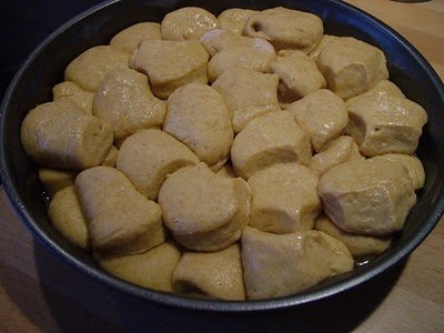 Ha megkelt, lisztes deszán átgyúrom, ujjnyi vastagra nyújtom, és kiszaggatom (vagy egy fém kör alakű szaggatót használok amit a fánkokhoz is, vagy egy pohár is tökéletesen megteszi). Egy tálkában vajat olvasztok. Egy kb 28 centis magas falú sütőtálat kikenek olvasztott vajjal. A kiszaggatott korongokat beleforgatom az olvasztott vajba, és szorosan egymás mellét teszem.