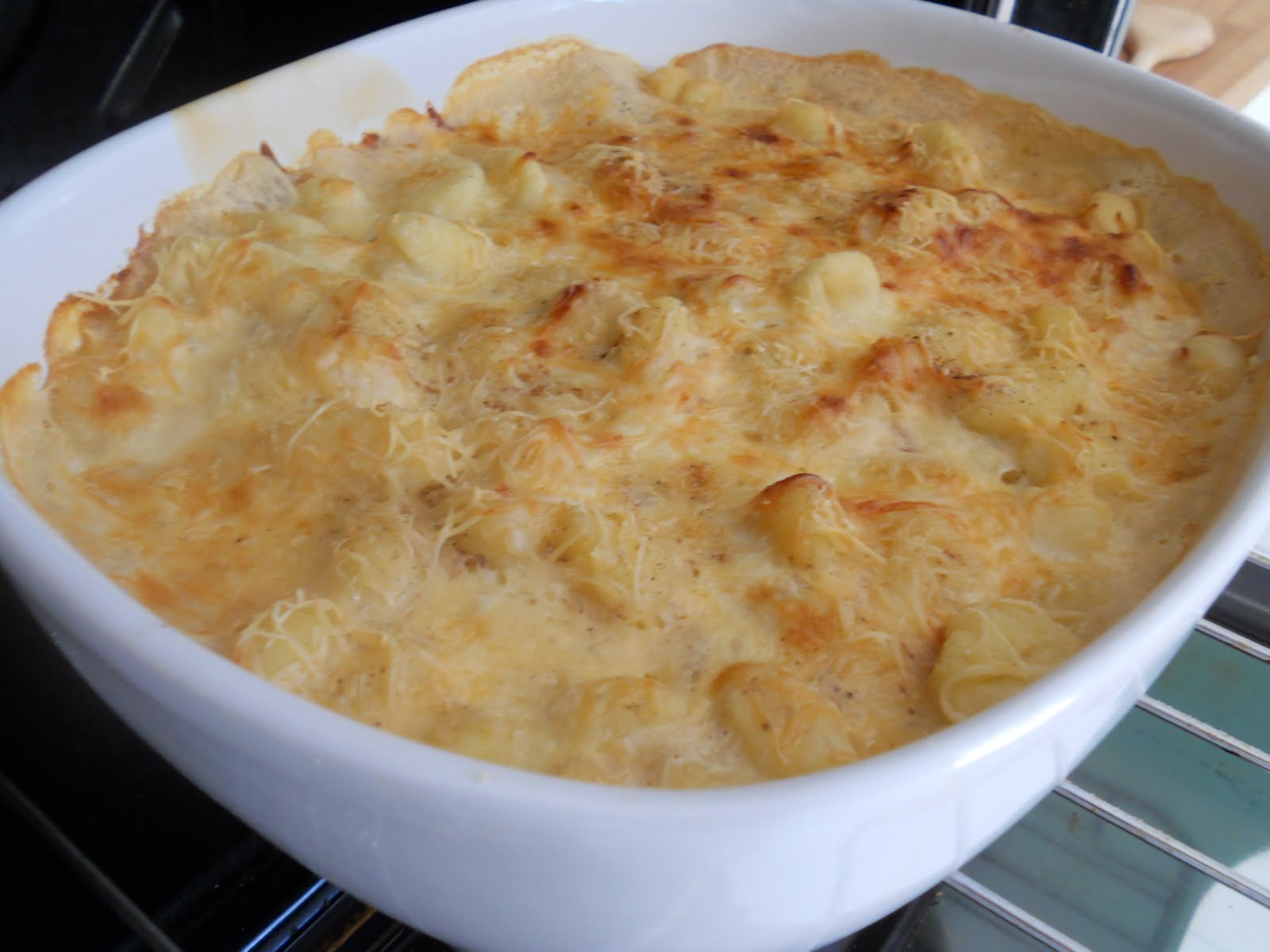 Egy adag gnocchit sütőtálba teszek, egy tálba öntök kb fél liter tejet, hozzáadom a sót, az őrölt fekete borsot, és 1 tk őrölt szerecsendiót. Ezt ráöntöm a gombóckákra, megszórom reszelt sajttal (emental).