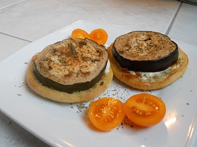 Bekapcsolom a sütőt grill fokozatra. A padlizsánt egyforma karikákra vágom, majd rácsra rakva mehet a sütőbe. Egy serpenyőbe 1-2 evőkanál fokhagymás olivaolajat teszek, megforrósítom, majd meg pirítom a zsemlekarikák mindkét oldalát, majd kiveszem. Felkarikázom a mozzarellát, ráhelyezem a padlizsánkarikákra, és ugyanabba a serpenyőbe teszem amiben a zsemléket megpirítottam. Kissé megfolyósítom a mozzarellát, sózom, borsozom és mehet a zsemlekarikákra. Amikor kész megszórom egy kis szárított bazsalikommal.