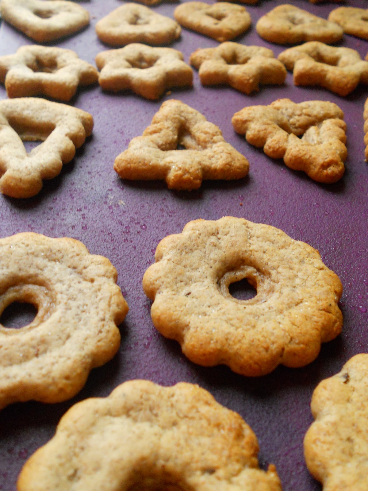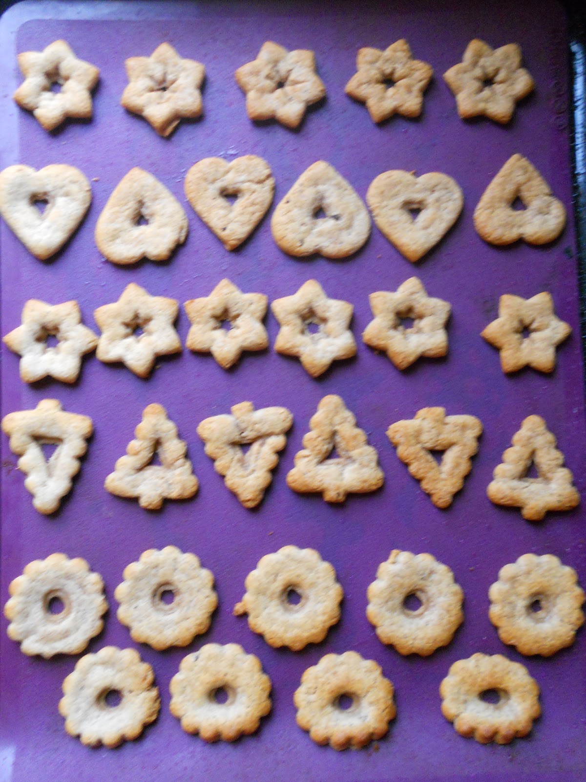 A kivágott alakzatokat szilikon lapra (vagy sütőpapírral kibélelt tepsibe) teszem, és az első adagot 200 fokra előmelegített sütőben 5-7 percig sütöm.