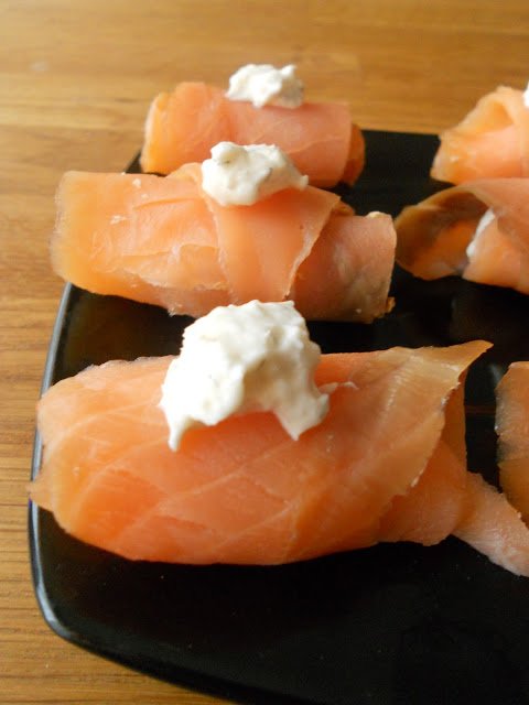 A lazacszeleteket “fel-háromszögezem”, majd magam elé teszek egyet úgy, hogy a háromszög talpa legyen felém. Kb a feléhez teszek egy teáskanálnyi krémet, majd feltekerem. Egy tálra helyezem, a tetejét a maradék krémmel díszítem.