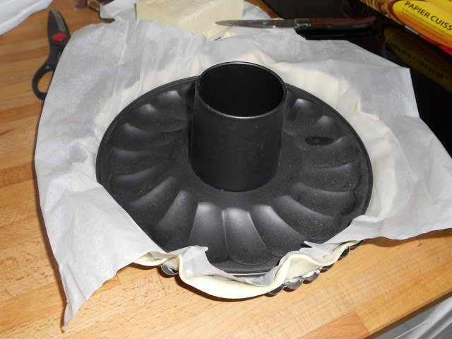 Ráteszek egy sütőpapírt, majd egy nehezéket (Én jelen esetben egy kuglóf sütő forma belsejét tettem rá)