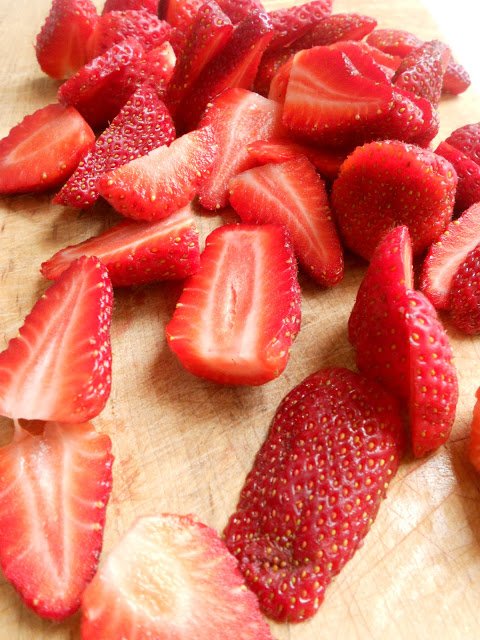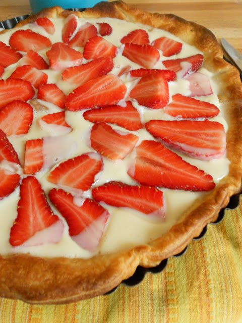 A kihűlt tésztára kanalazom a pudingot, és rápakolom az eper darabokat.