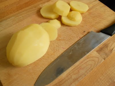 A sütőt előmelegítem 200ºC-ra. A burgonyát megpucolom vastagabb karikákra vágom és hideg sós vízbe téve felforralom, majd (a forrástól számítva) 4 percig főzöm, majd leszűröm.