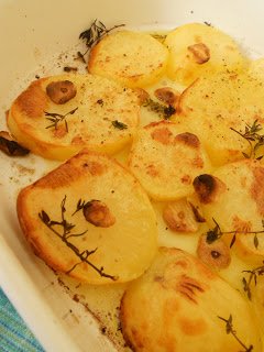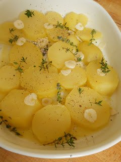 Egy nagy hőálló edényt megkenek egy evőkanál olajjal, majd rárakom a burgonyát, a szeletekre vágott fokhagymát és a kakukkfüvet. Sózom, borsozom, majd megspriccelem a megmaradt olívaolajjal és 20 percre sütőbe rakom.