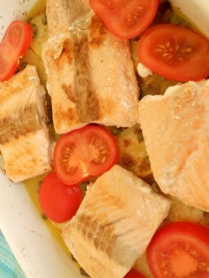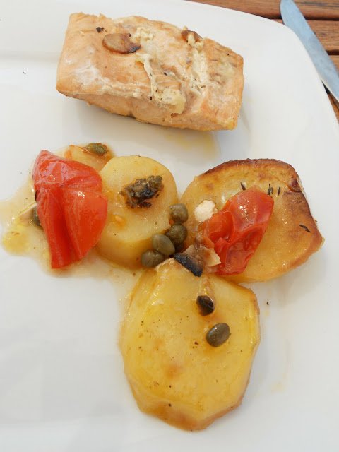 Közben a lazacfilék mindkét oldalát megsütöm egy teflon serpenyőben. A halszeleteket a burgonyára teszem, megszórom citromhéjjal és meglocsolom a citrom levével. Rászórom a kapribogyókat és a paradicsomszeleteket és ráöntöm a fehérbort vagy a húslevest.