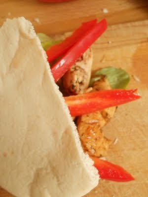 - Ha megsült a hús lezárjuk, majd a felvágott pitába rakjunk egy kevés madársalátát, majd rá a fűszeres húst és a felcsíkozott paprikát.