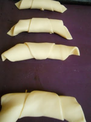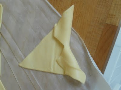 A kinyújtott leveles tésztát egyenlő háromszögekre vágjuk, és a “talpukkal” magunk elé rakjuk.
