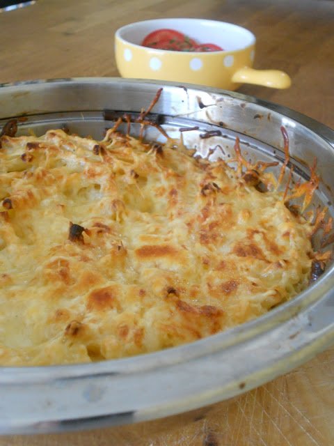 Egy süthető tálba tesszük a reszelt sajtot a tejet és a felvert tojásokat, összekeverjük, sózzuk, borsozzuk, hozzáadjuk az őrölt szerecsendiót. Végül belekeverjük a makarónit, és a nagyon forró sütőben kb 10-15 percig sütjük.
