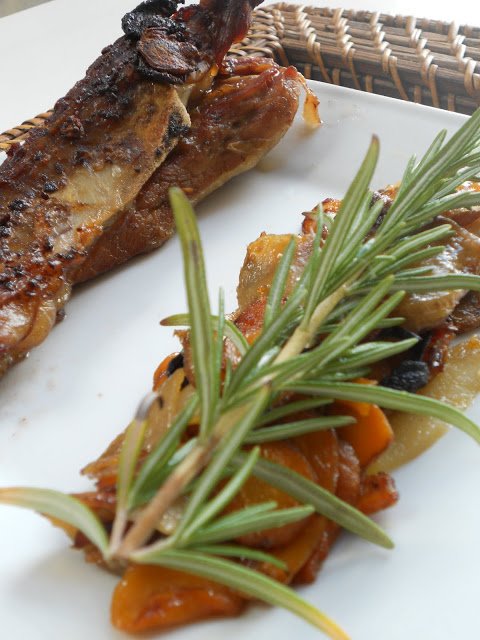 Tálaláskor egy tányérra rakjuk a húsdarabokat, és mellérakjuk a zöldségeket, és egy kis rozmaringággal díszíthetjük.