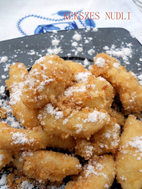 Nálunk mostanában a szilvás és sárgabarackos gombócok is apróra darált, és olívaolajon enyhén megpirított kekszmorzsában vannak megforgatva. Jelen esetben a nudlik is abban lettek meghempergetve, majd porcukorral enyhén meghintve.