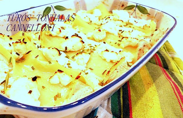 A töltött cannellonikra öntsünk egy deci fehérbort, végezetül szórjuk meg a maradék túróval, és tekerjünk rá néhány csavarásnyi tarkaborsot.