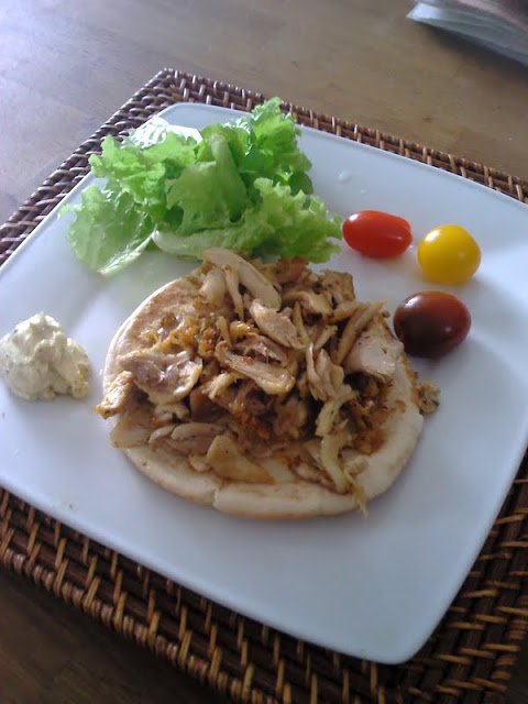 A lebontott grillcsirkét felforrósított teflonserpenyőben folyamatos kevergetés mellett süssük még egyszer át, majd fűszerkeverékkel ízesítsük! Pitával/ban és salátával tetszés szerinti szósszal kínáljuk!