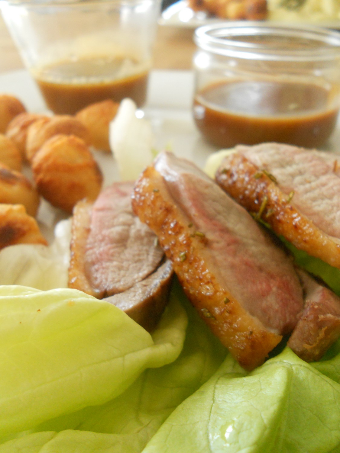 A kacsamelleket a bőrükkel lefelé tegyük egy felforrósított serpenyőbe, majd ha már megpirult, fordítsuk meg és a másik oldalukat is pirítsuk meg. Vegyük ki, és a bőrükkel felfelé tegyük egy sütőtálba, és 20-25 perc alatt süssük készre.