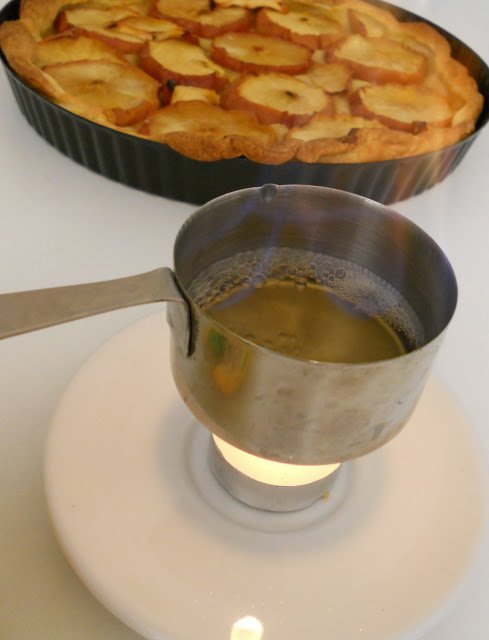 tegyünk fél deci calvadost egy kisebb nyeles fém edénybe. Tartsuk láng fölé, hogy felhevülhessen, majd gyújtsuk meg, hogy a calvados elveszítse alkoholtartalmát, ezzel egy fokozott új ízt kapva.