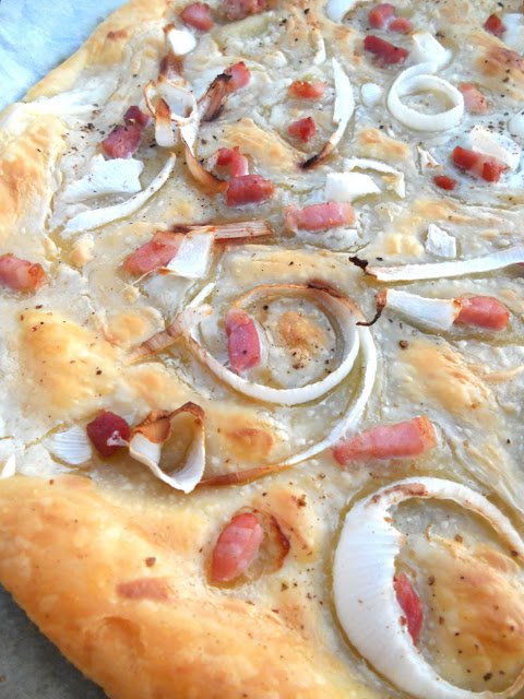 A vékonyra nyújtott levelestészta tetejét kenjük meg a tejfölös juhtúróval, majd szórjuk meg a szalonnával és a szeletelt vöröshagymával.