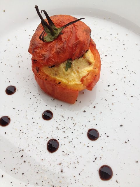 A zöldségeket mossuk meg, majd töröljük szárazra. A paradicsomok aljából egy 2-3 mmes részt vágjuk le. Fontos, hogy (viszonylag) egyenes legyen a vágás, mert ezzel gátoljuk meg, hogy a tojások eldőljenek. Az is fontos, hogy ne túl sokat vágjunk le, mert a kikapart üregünk így lyukas lesz, és könnyen kifolyik belőle a tojás.