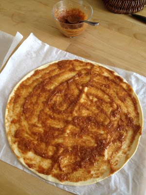 Egy tálba keverjük össze a sárgabaracklekvárt a mandulával és a mézeskalács fűszerkeverékkel, a leveles tészta lapokat tegyük egymás mellé.