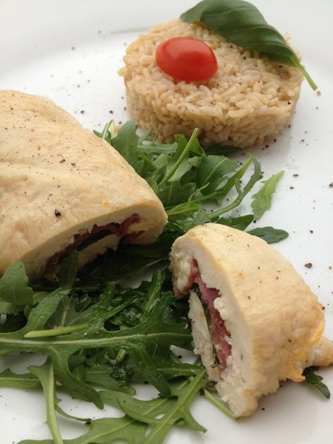 Tegyük rá a serrano sonkaszeletet, a fetasajtkockákat, és a bazsalikomleveleket. Sózzuk, borsozzuk, majd tekerjük fel. Tűzzük meg egy hústűvel (vagy fogpiszkálóval) és tegyük az Actifry alsó részébe, spricceljük meg egy kevés olívaolaj permettel és állítsuk be 16 percre.