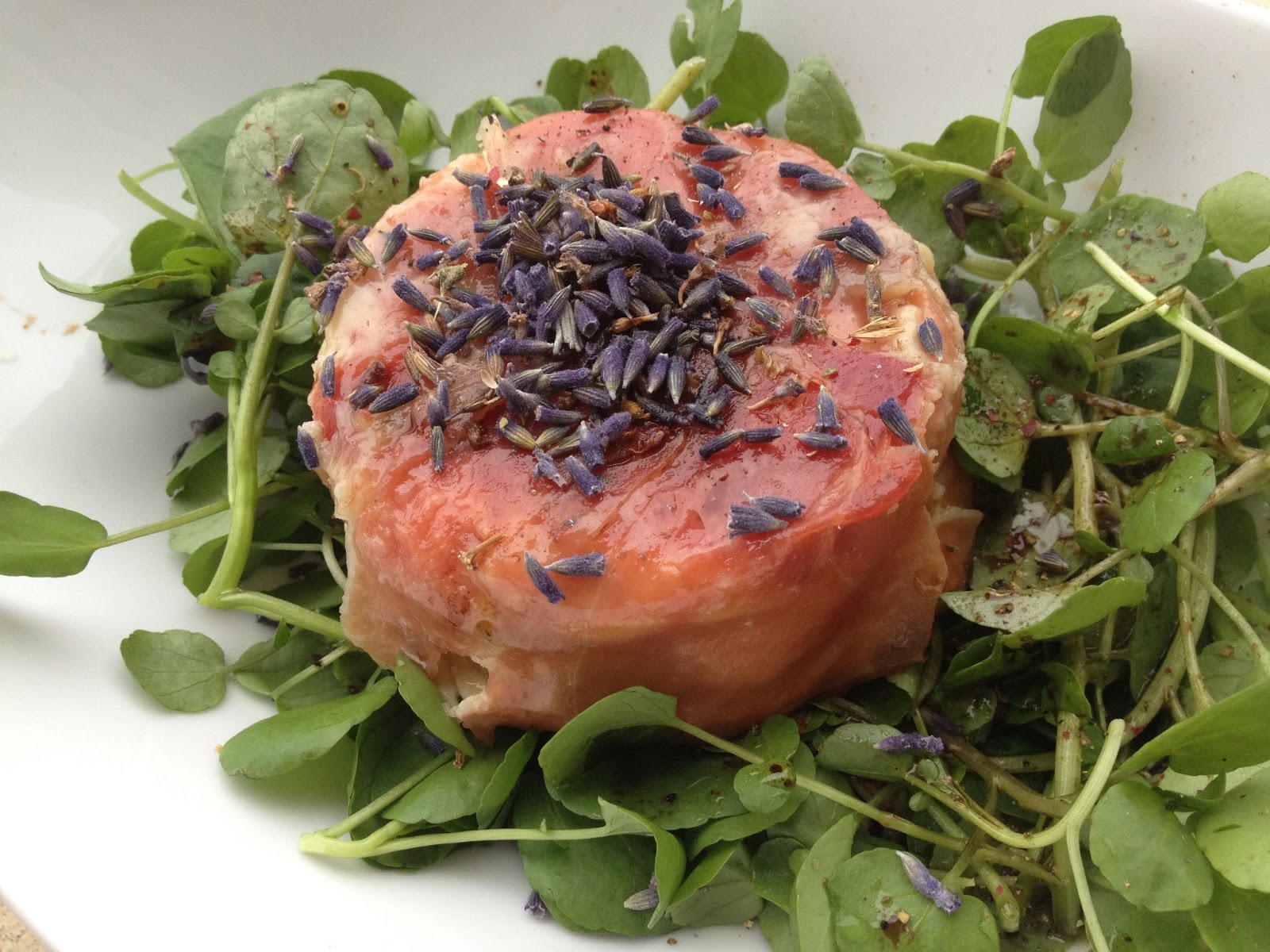 Óvatosan vegyük ki az alufóliából, majd helyezzük salátaágyra (az a rész kerül alulra ahol a szalonnák összeérnek) megszórjuk levendulavirággal, és locsoljuk meg egy kávéskanál balzsamecettel.