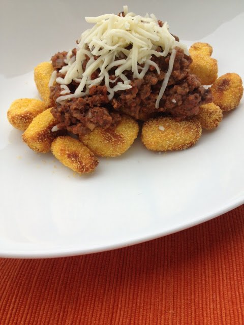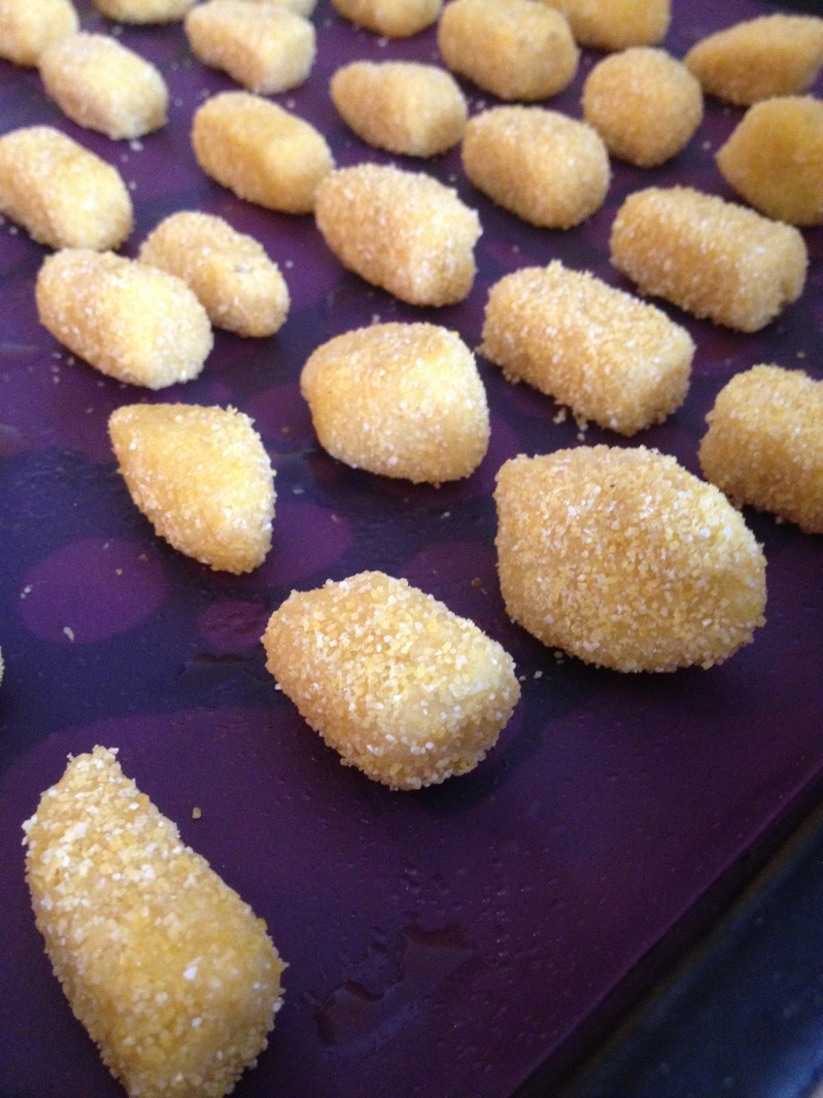 A burgonyát héjában főzzük, majd tisztítsuk meg, és nyomjuk át pürényomóval. Adjuk hozzá a kukoricadarát, a tojást és a sót. Gyúrjuk össze, és tegyük félre fél órára (hogy meg tudja magát szívni).