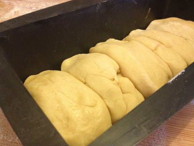 Ha megkelt, gyúrjuk újra, és osszuk szét hat egyenlő nagyságú golyóra. Tegyük egy kivajazott kisebb kenyérsütőformába egymás mellé a gombócokat, majd ruhával fedjük le és hagyjuk megint megkelni.