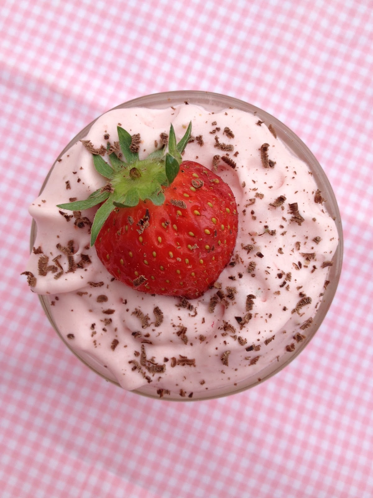 Rázzuk össze, majd nyomjuk kínálópoharakba, tegyünk rá eperszemet és reszeljünk rá csokoládét.
