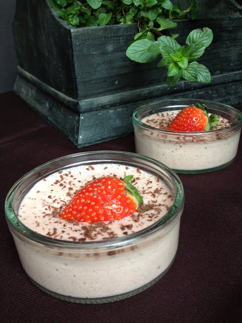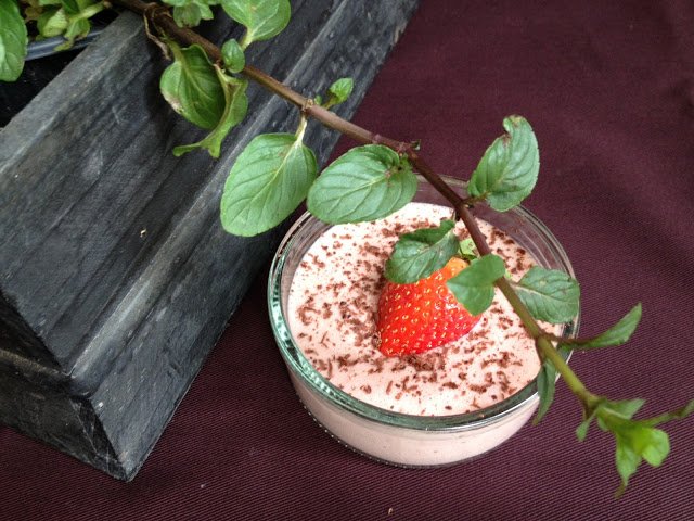 Porciózzuk ki két kisebb kínálótálba , tegyünk bele 1-1 szem epret, és reszeljünk rá egy kevés csokoládét. Tálalás előtt tegyük hűtőbe 1-2 órára.