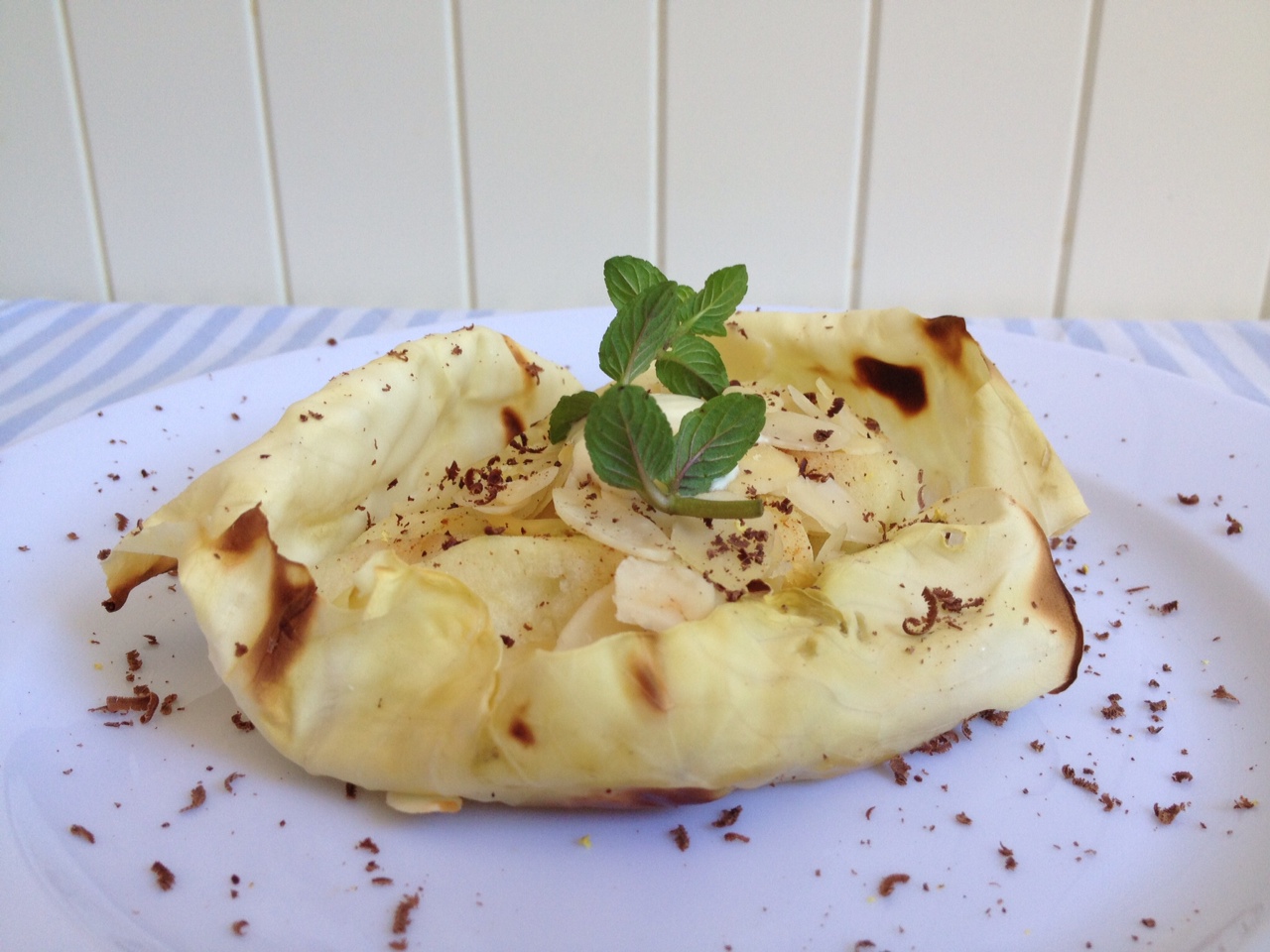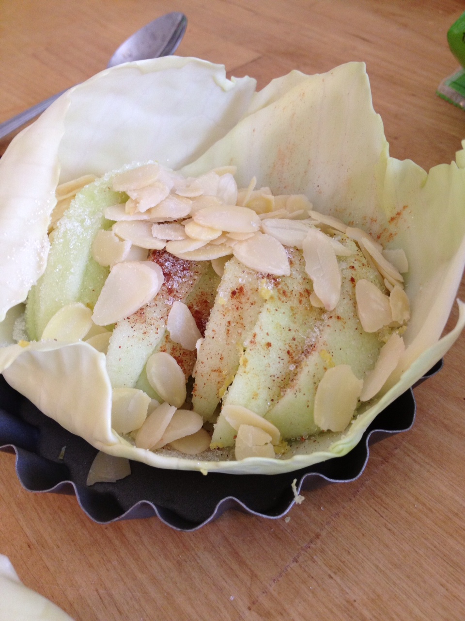 Elsőre lehet kicsit meghökkentő a párosítás, de hátha pont ezért fogjátok kipróbálni! A “sütemény” tésztáját a káposztalevél adja, az alma pedig a mandulával együtt a töltelék. A káposztás kosarat nem kell megenni ha valaki ódzkodik tőle, bár szerintem fantasztikusan passzolt az almához.
