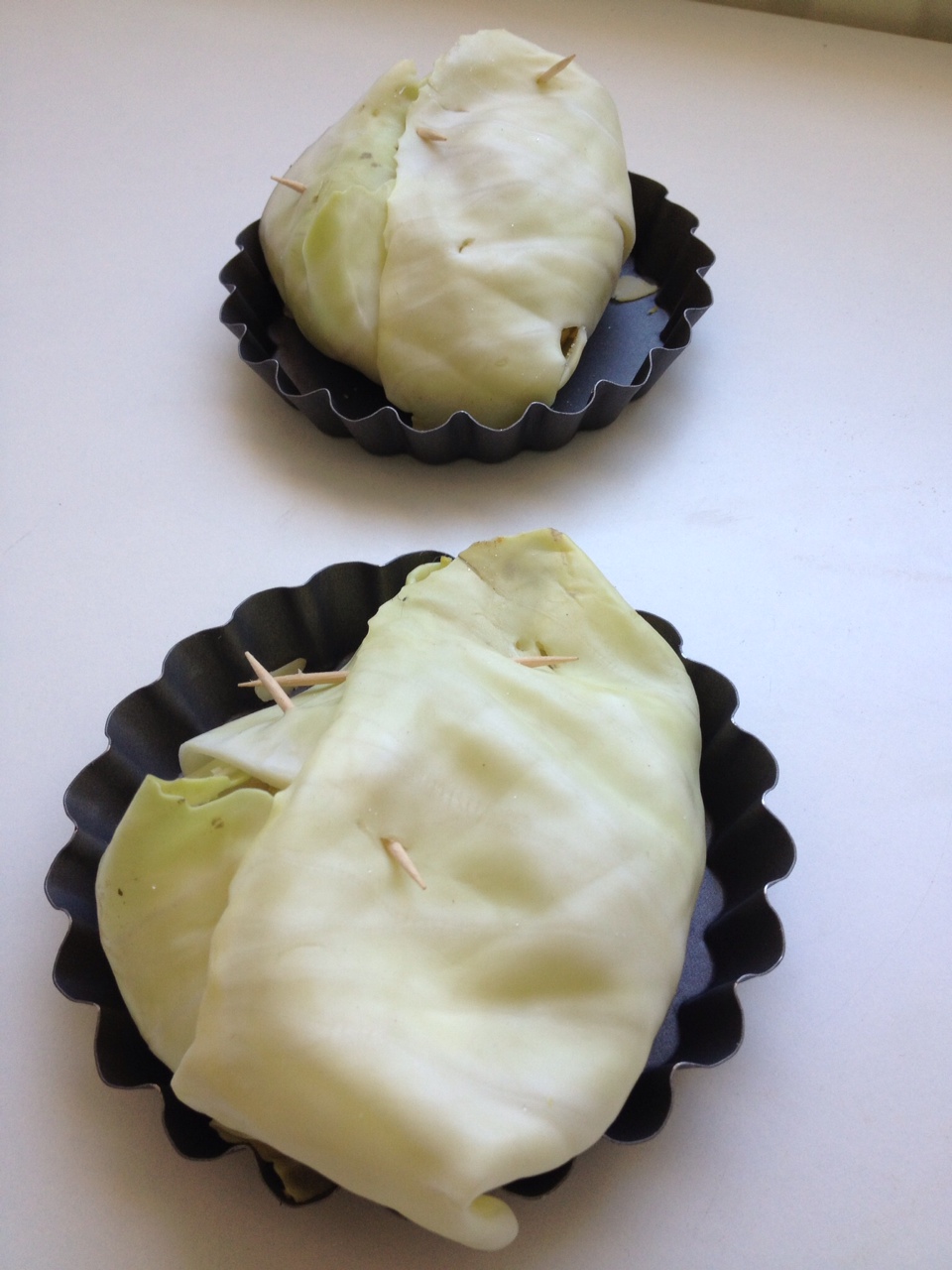 A káposztalevelekből a vastag, erős eret vágjuk ki, majd tegyük egy pl tartelette formába.