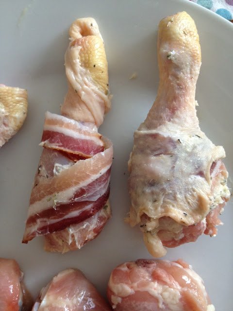 Tekerjük rá a bacon szeleteket, majd húzzuk rá a bőrét, és kívülről is kenjük be a fűszeres vajjal.