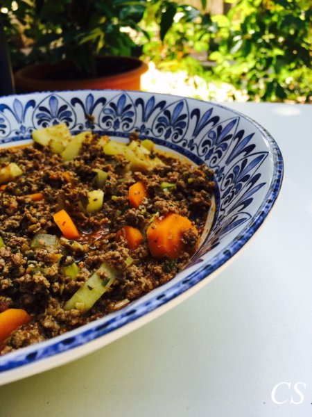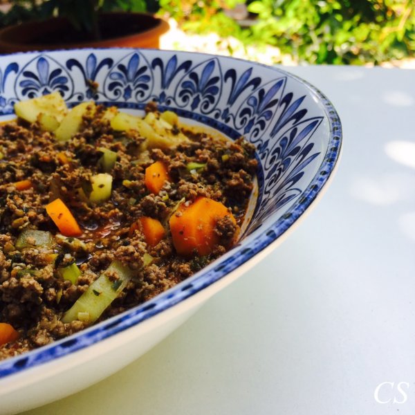 A paradicsomot, a sárgarépát és a cukkinit hámozzuk meg, és daraboljuk fel. A ledarált húst a felaprított hagymával és a sárgarépával kevés zsiradékon pirítsuk meg. Adjuk hozzá a fűszereket, majd öntsük fel annyi vízzel, hogy épp ellepje. Fedő alatt pároljuk addig, míg épp roppanós lesz a sárgarépa. Adjuk hozzá a feldarabolt cukkinit és fedő alatt pároljuk készre.