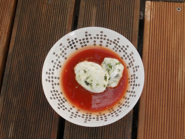 Könnyű paradicsomleves bazsalikomos fehérjehabbal.