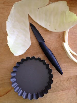 A káposztalevelekből a vastag, erős eret vágjuk ki, majd tegyük egy pl tartelette formába.