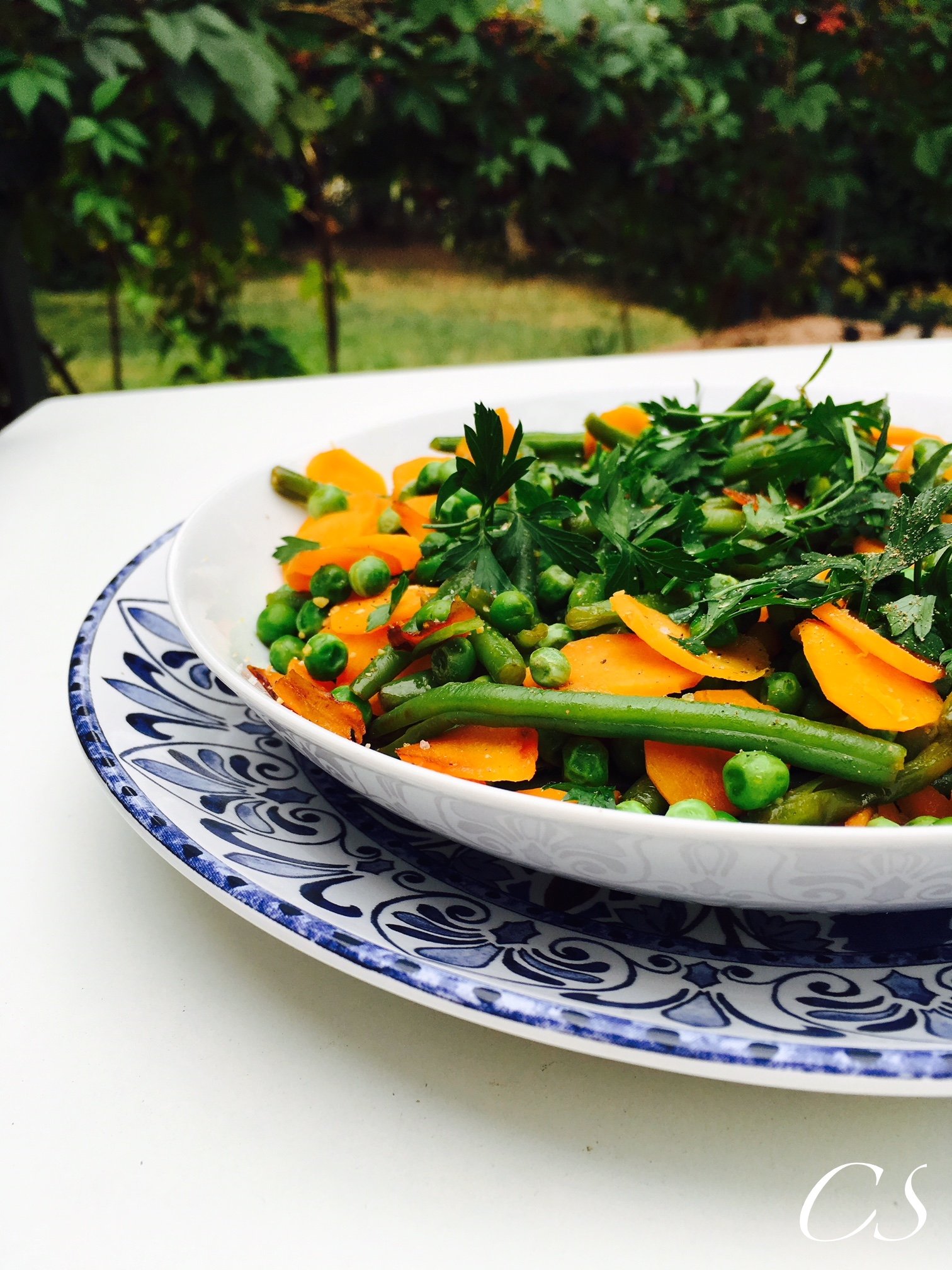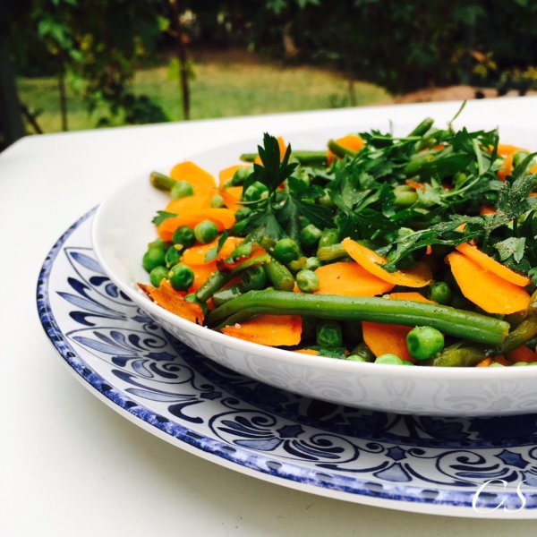 Már elég sok, és változatos köret található meg a blogon, a mostani is egy nagyon egyszerűen, és gyorsan elkészíthető (10 perc). Igazából ez a már posztolt párolt sárgarépa és fokhagymás párolt zöldbab köret keveréke egy kis zöldborsóval felturbózva.